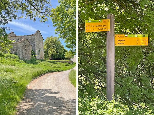 Continúa hasta alcanzar la parte trasera de dos viviendas que ya no disponen del tejado. Junto a ellas, verás este poste indicativo. Debes tomar el desvío a la derecha, en dirección Bagüeste-Rodellar.