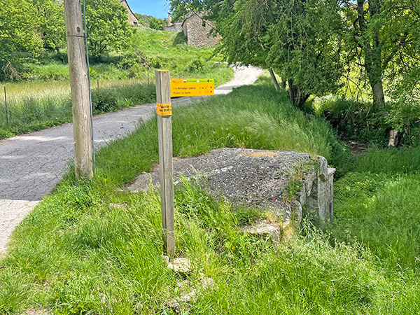 A pocos metros pasarás junto a la fuente de Las Bellostas, donde tenemos como referencia este poste indicativo.