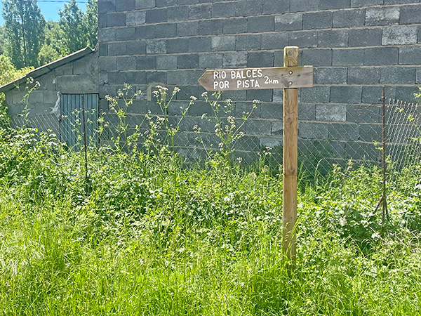 Continúa un poco más y, a la izquierda, verás un sendero señalizado con este poste, que indica «Río Balcés por pista 2 km».