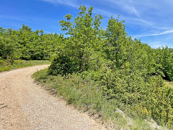 Ya estamos en la pista forestal. Siguiéndola poco a poco, iremos dejando atrás el núcleo de población y adentrándonos en un entorno cada vez más natural y silencioso.