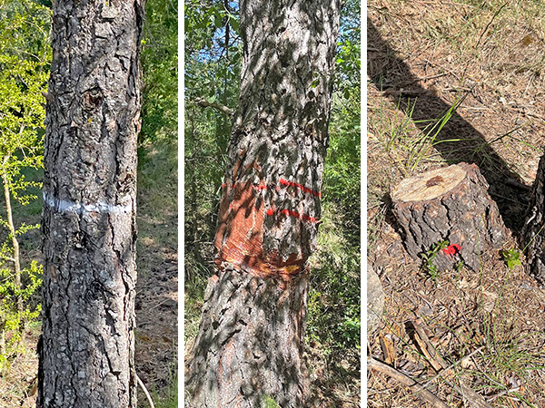 • Color rojo para señalar los árboles sobre los que se debe actuar. Los diferentes símbolos indican el tipo de trabajo a realizar. Un punto rojo significa árbol a cortar y una doble línea roja, que se ha de realizar un anillamiento o corte en la corteza.