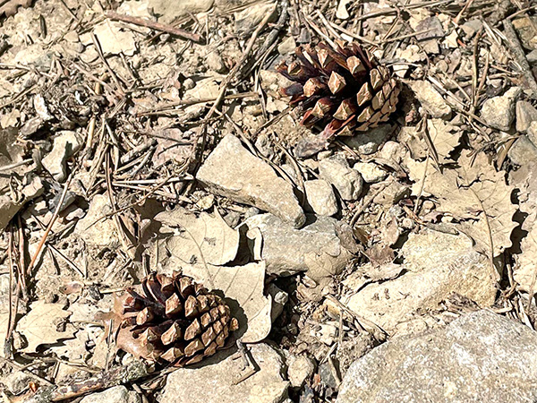 Como estás en un bosque de pinos, seguro que ves muchas piñas que han ido cayendo al suelo.