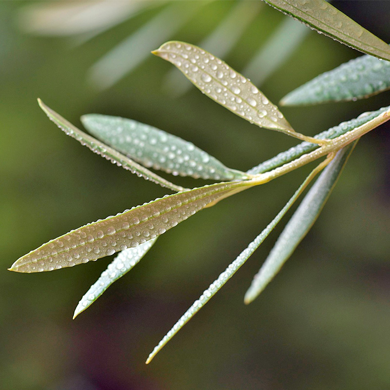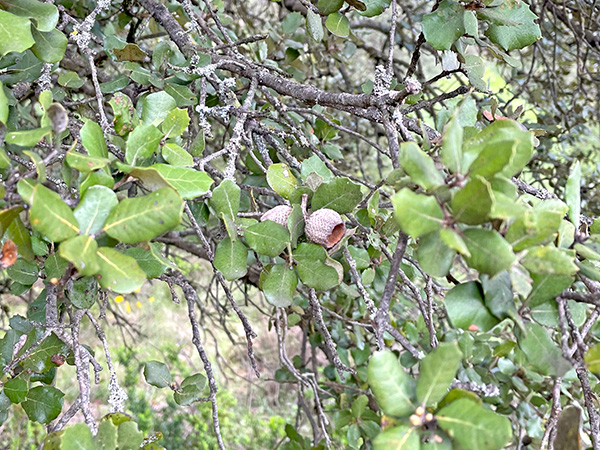 Las hojas, perennes y de forma elíptica, son coriáceas (duras y flexibles, de textura similar al cuero) y presentan un tono verde más brillante en el haz y más oscuro en el envés. En sus primeros años, las hojas suelen tener bordes espinosos, lo que le da un aspecto similar al del acebo.