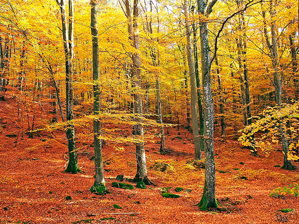 Además de su gran porte, lo que más llama la atención de las hayas es la variedad de colores y tonos que sus hojas van adquiriendo a lo largo del año conforme cambiamos de estación. Tras el verde intenso que adquiere en primavera, pasa a tonos rojizos, pardos y amarillos en otoño, antes de caer al suelo y crear un vistoso manto de color a sus pies.